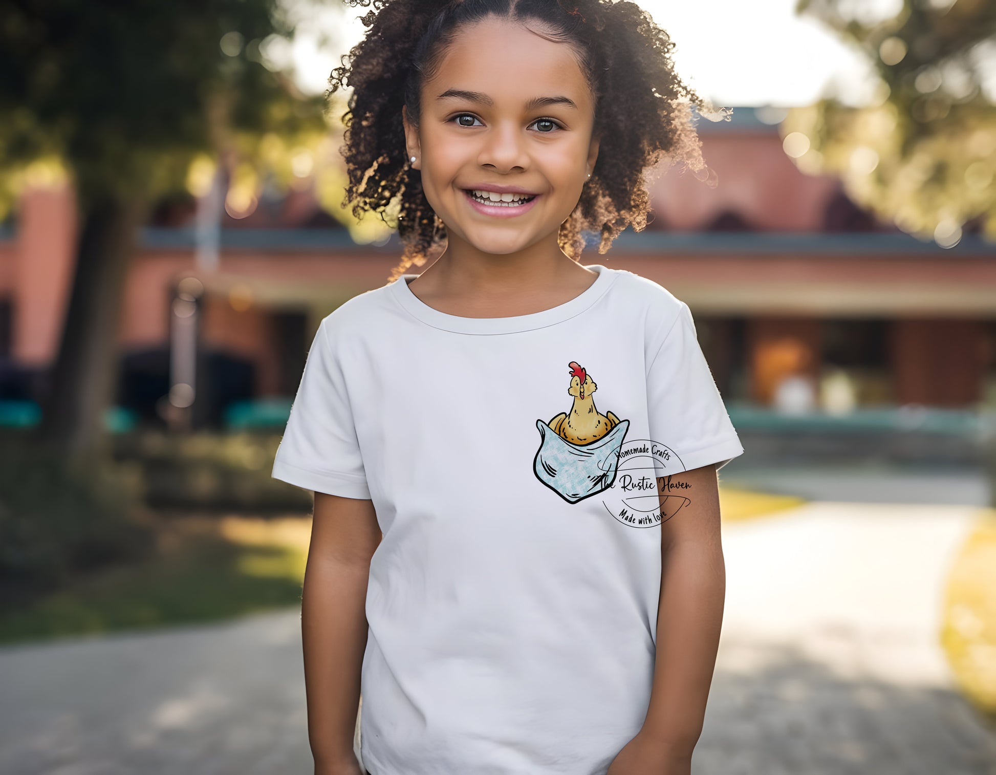 This playful kids' t-shirt features an adorable chicken pocket pal, bringing a quirky flair to any outfit. Perfect for little ones with a fun-loving personality, this tee will surely become their new favorite. Get ready for clucks of excitement from your little fashionista!