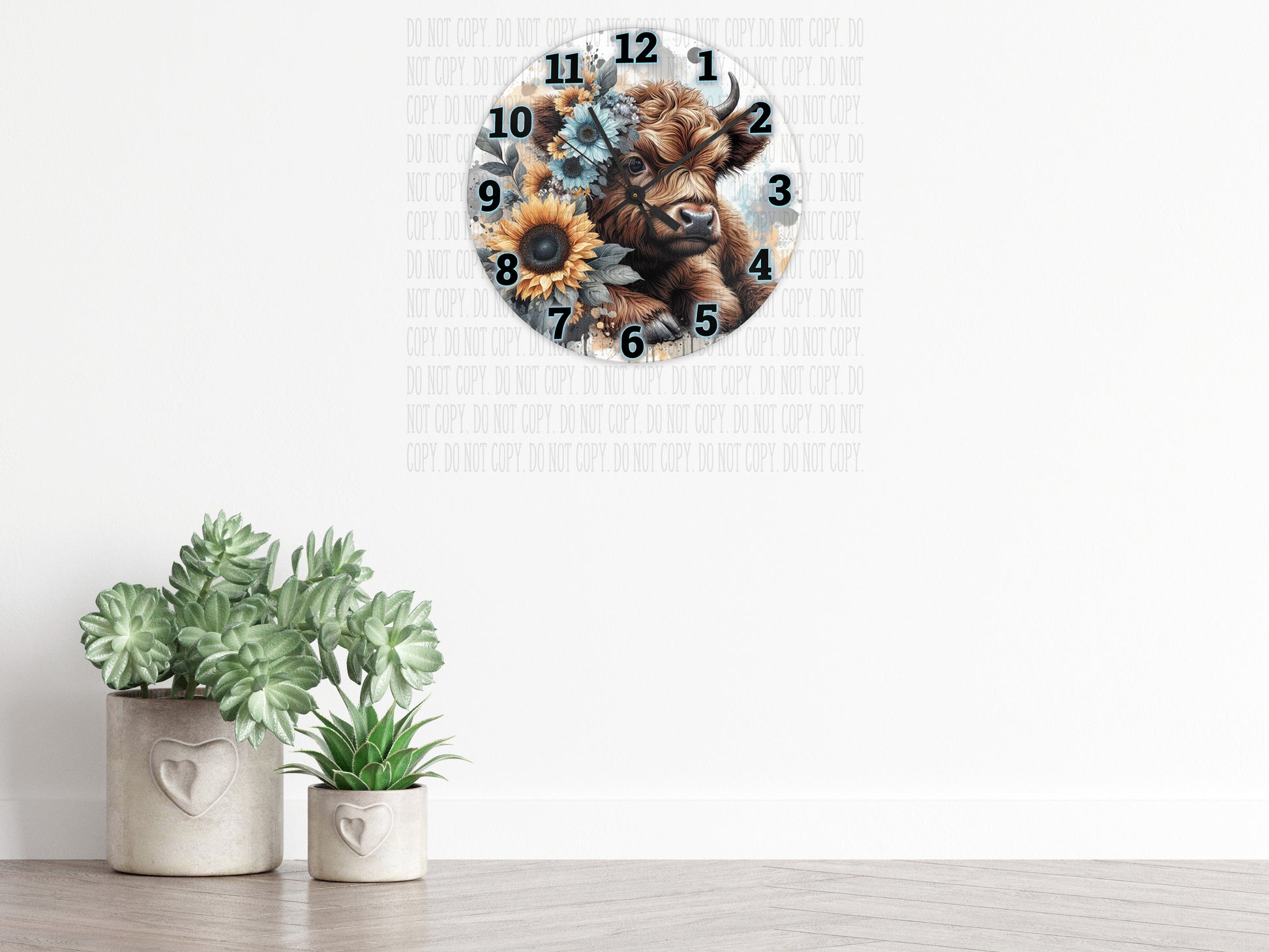 Introducing the Adorable Cow and Sunflowers wall clock. Made from durable MDF wood, this charming clock comes in 3 sizes. Bring a touch of farmhouse style to any room with this unique timepiece. Perfect for adding a cheerful and whimsical touch to your home decor. Available now!
