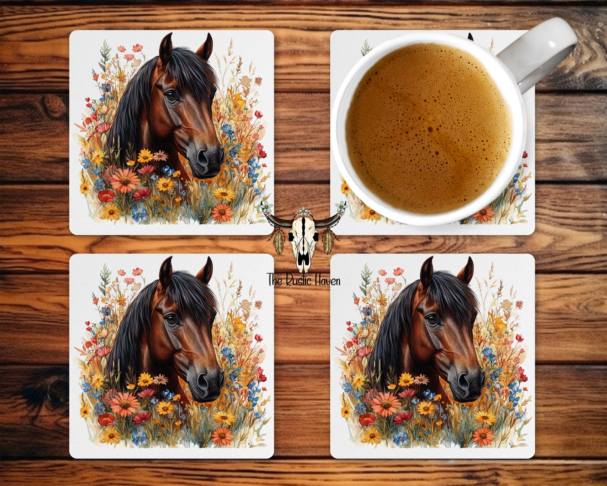 These beautiful horse and floral coasters come in a set of 4 and are 4 inches in diameter. Keep your tables protected in style with these elegant coasters, complete with a mahogany holder. Perfect for any horse or floral lover, these coasters are both practical and aesthetically pleasing. Coaster material is MDF