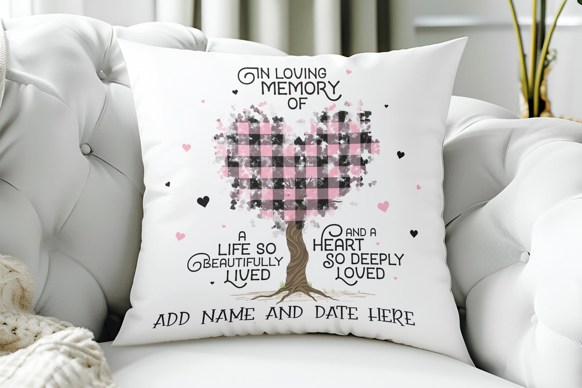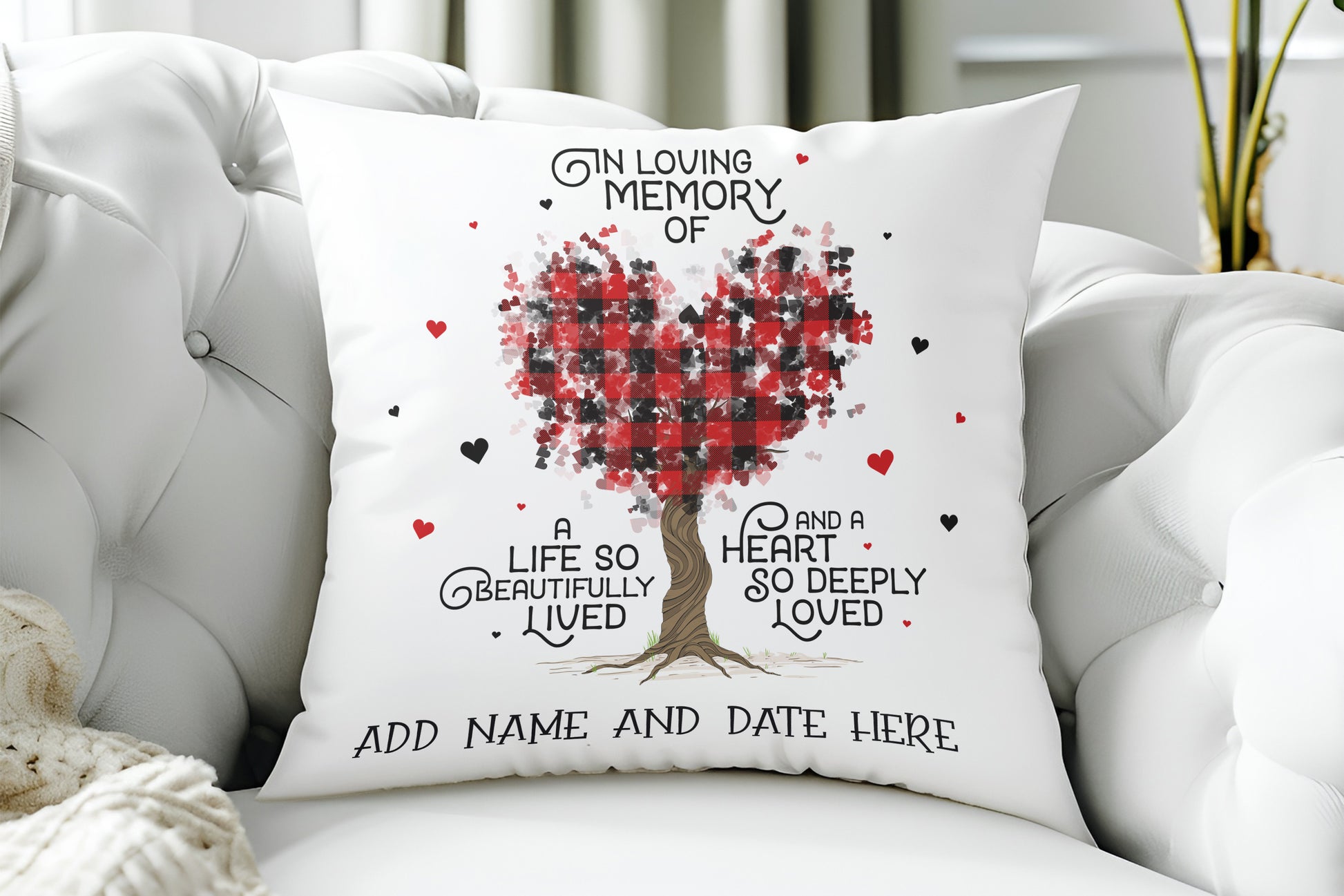Honor a loved one with our Beautiful heart Tree Personalized Memorial Pillows. Choose from 5 gorgeous colors and add a custom touch with their name and date. Each pillow features an elegant heart tree design, and the saying " In loving memory of a life so beautifully lived and a heart so deeply loved." creating a unique and lasting tribute. Approx. 16in x 16in. Show your love and remembrance with one of these special pillows.