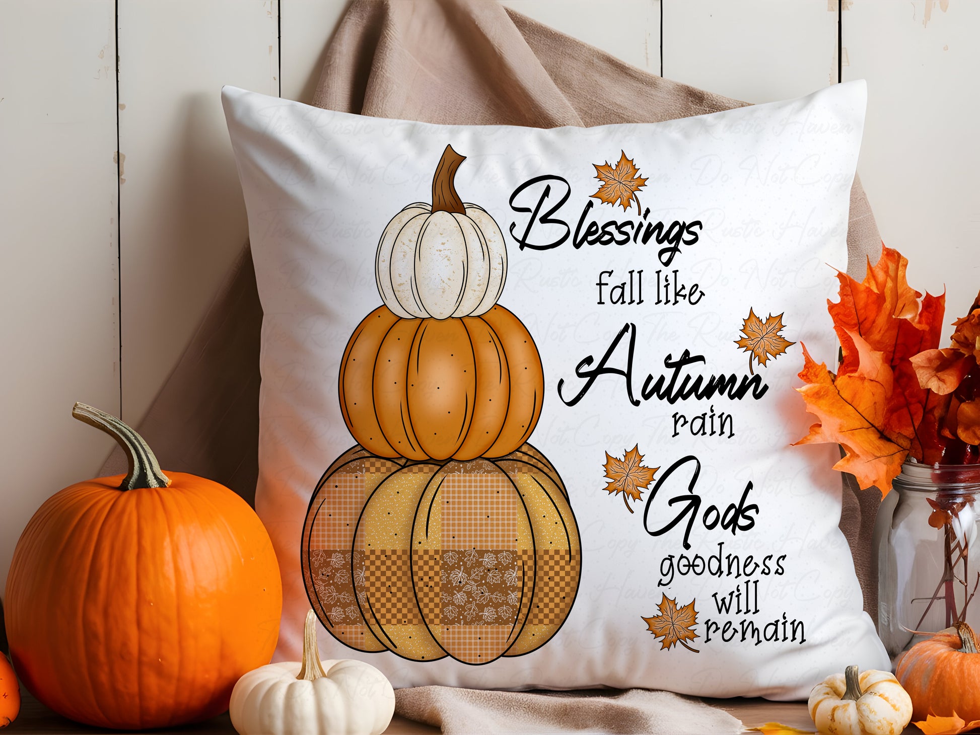 Blessings Fall Like Autumn Rain Pillow – Rustic Farmhouse Pumpkin Stack Decorative Throw