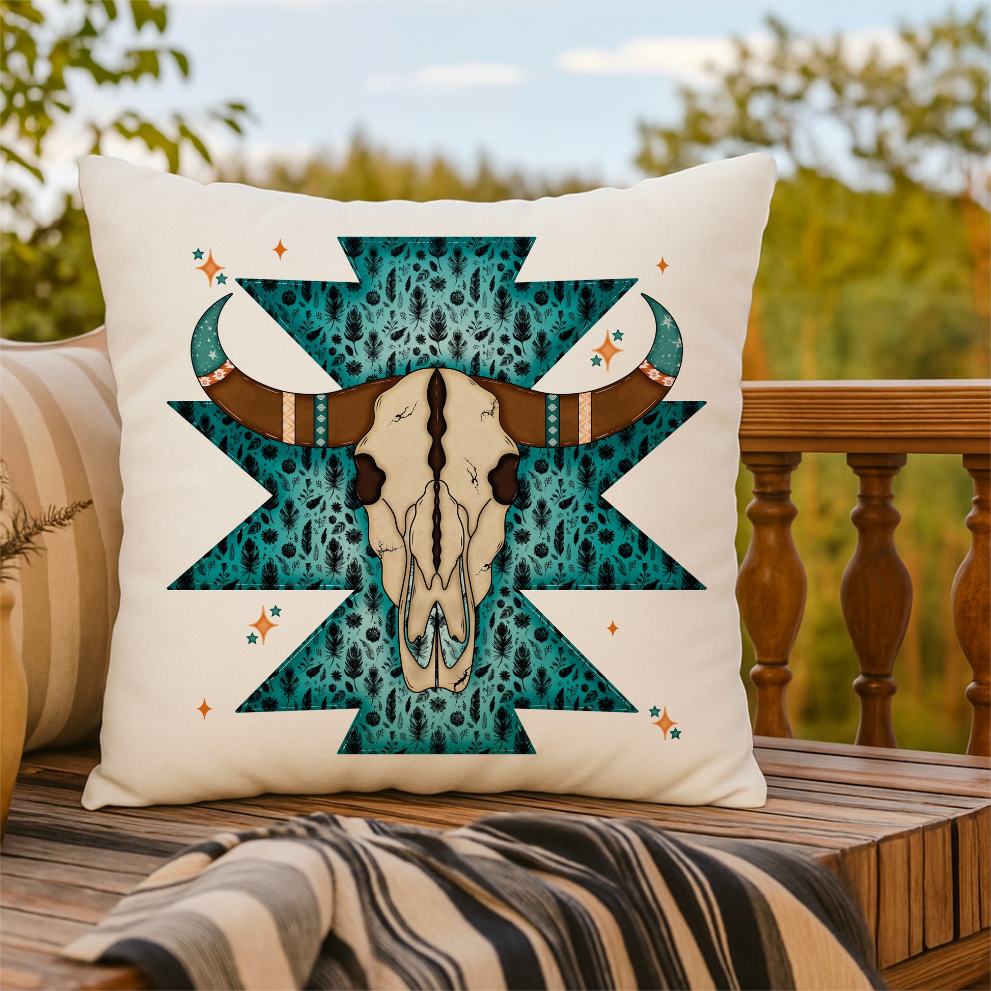 Boho Western Bull Skull Throw Pillow – Turquoise Aztec Design