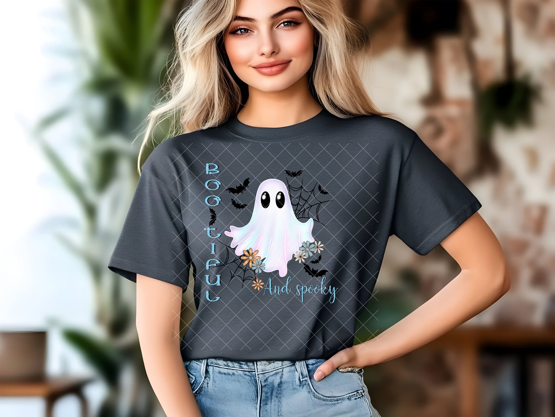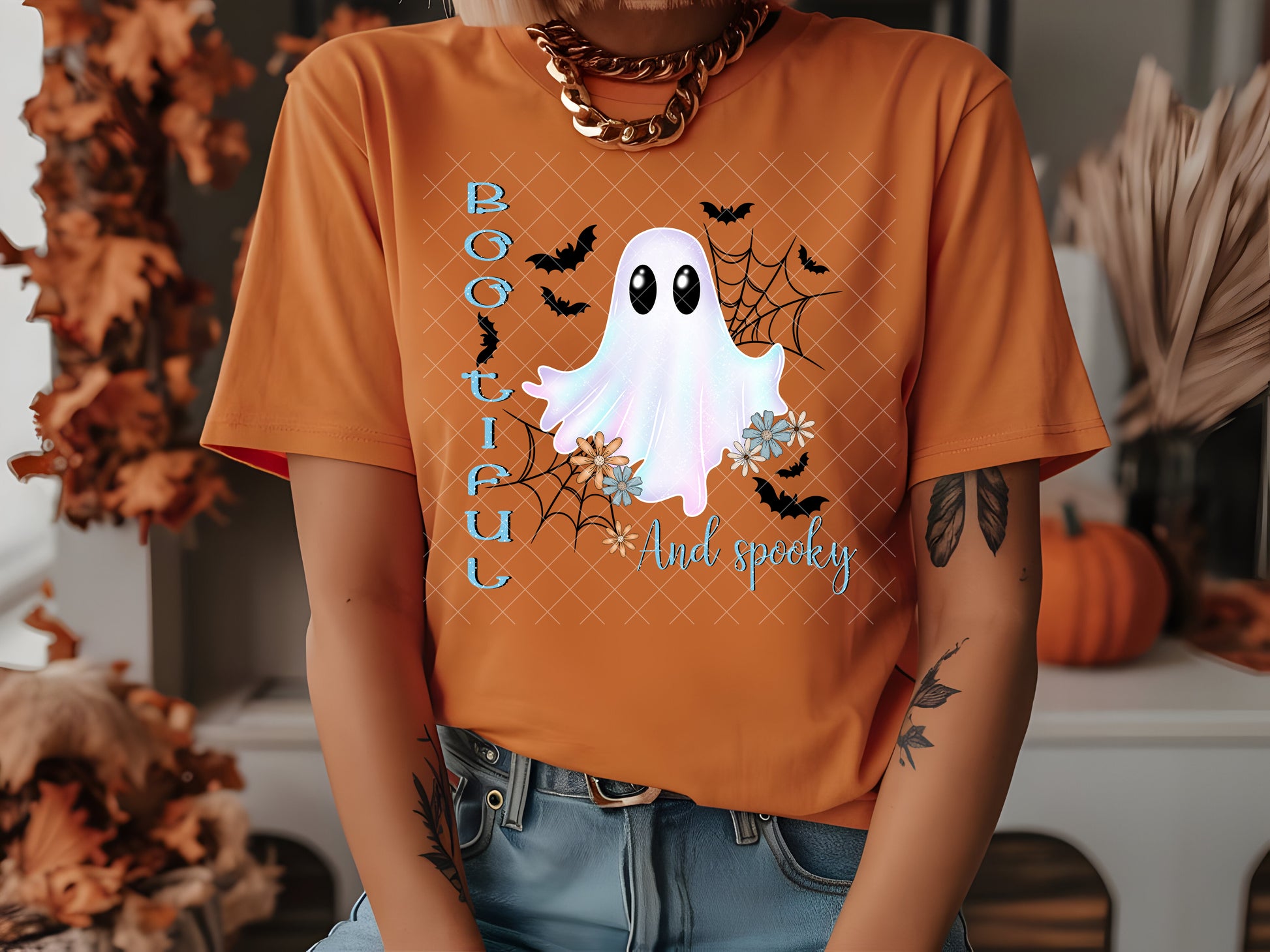 Get ready to haunt in style with our Bootiful and Spooky Halloween t-shirt! This pastel ghost design features a sweet, whimsical ghost surrounded by bats, flowers, and spiderwebs—perfect for cozy autumn vibes or festive Halloween parties. Printed on a soft  tee, it offers comfort and charm in equal measure. Great for casual wear, spooky season gatherings, or lounging in Halloween-themed pajamas.