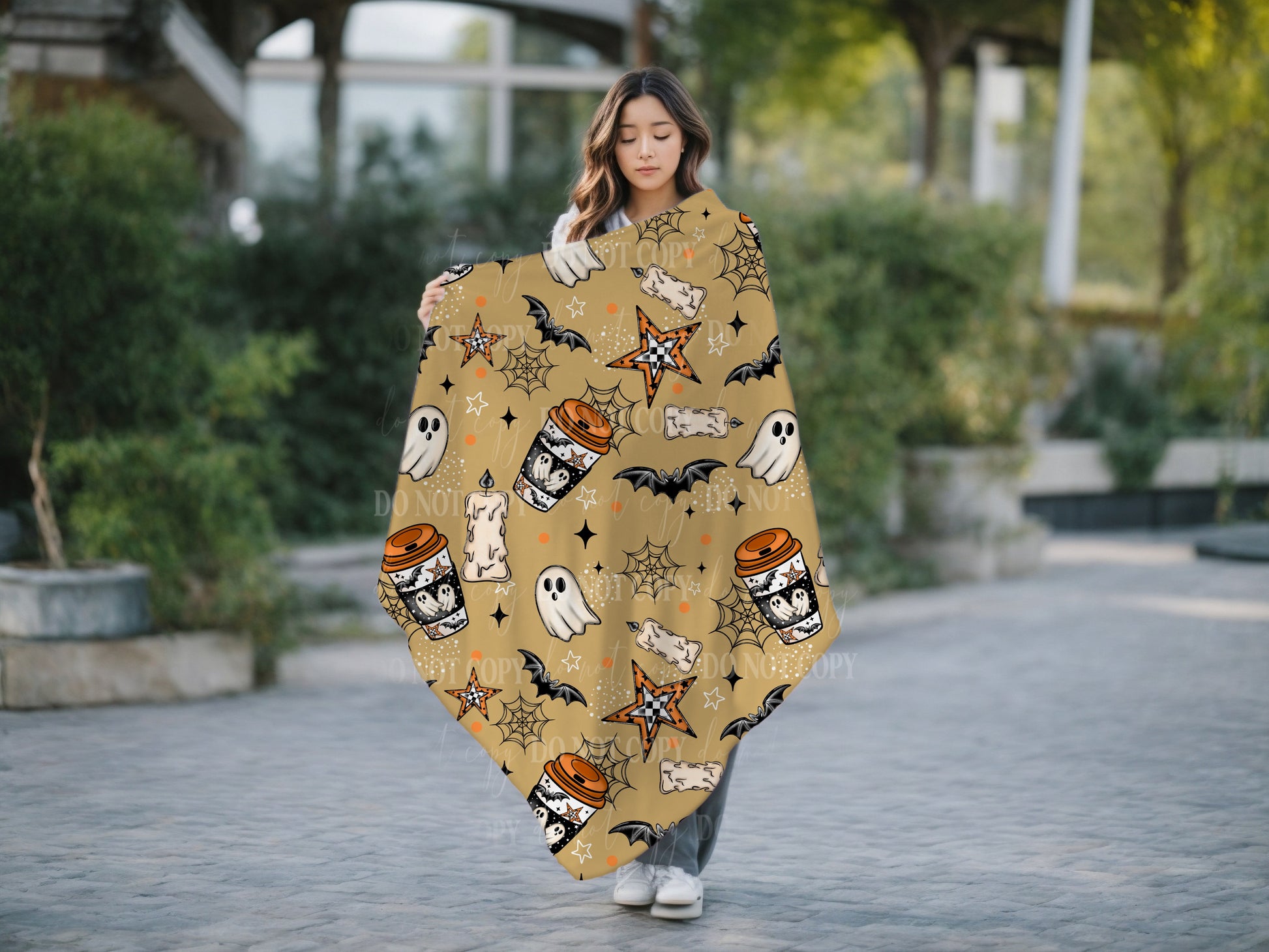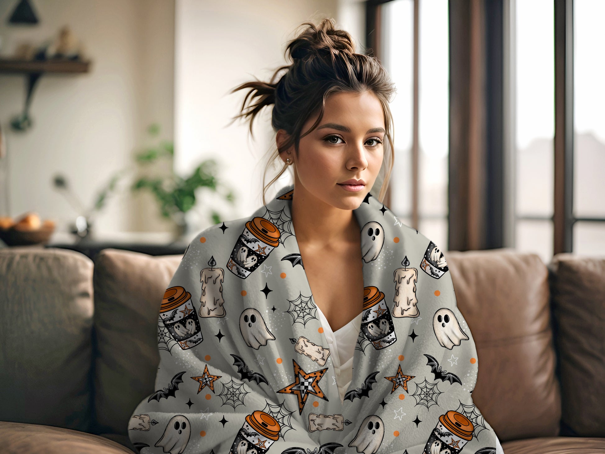 Cozy Halloween Blanket – Ghosts, Bats & Pumpkin Coffee | 2 Color Options