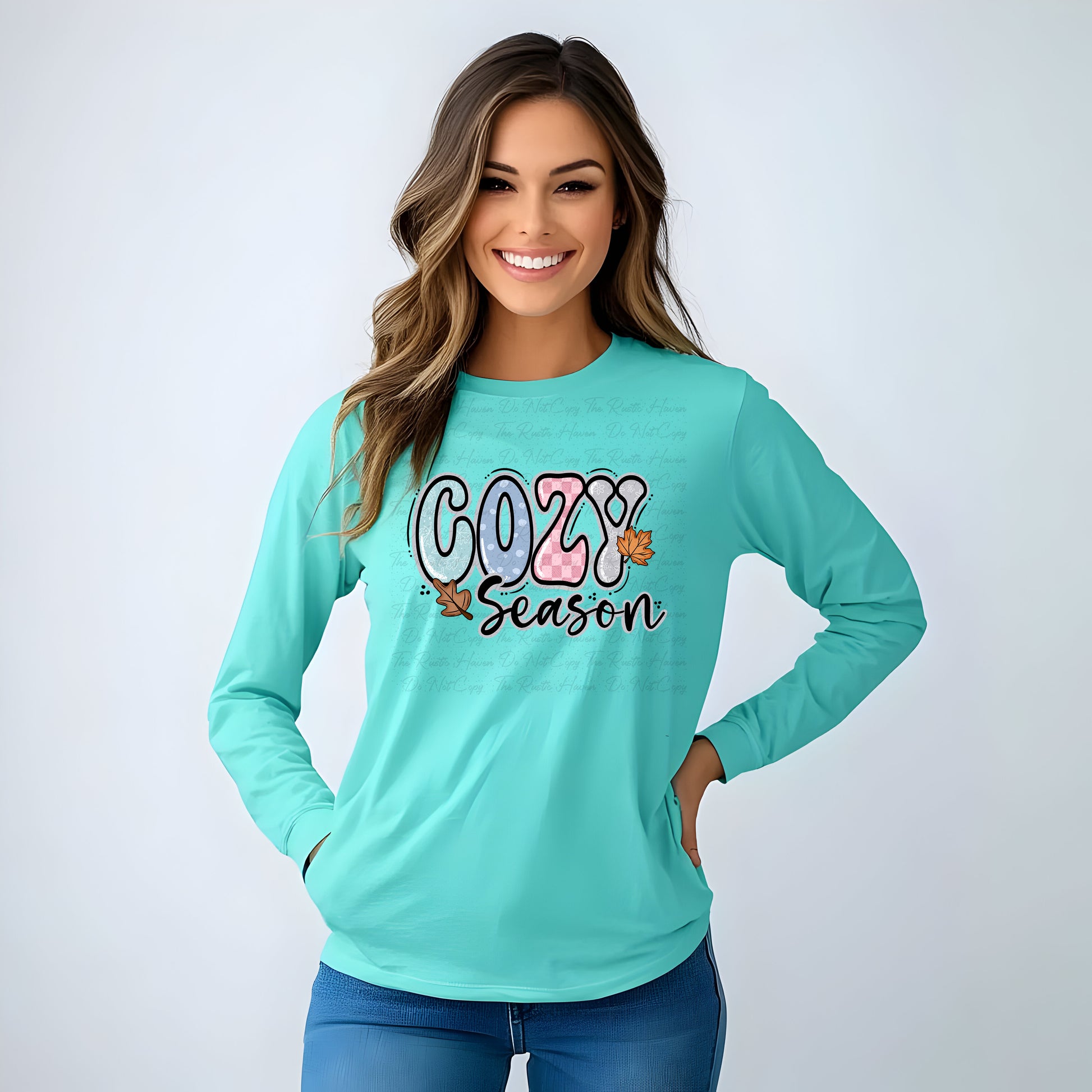 Stay warm and stylish this autumn with our Cozy Season long sleeve shirt. Featuring a charming pastel letter design accented with fall leaves, this tee is perfect for pumpkin patch visits, coffee runs, or curling up with your favorite book. Available in 4 shirt colors, it’s soft, comfortable, and made for all-day wear. Whether you're layering it under a cardigan or pairing it with jeans, this shirt is your go-to for celebrating the coziest season of the year.