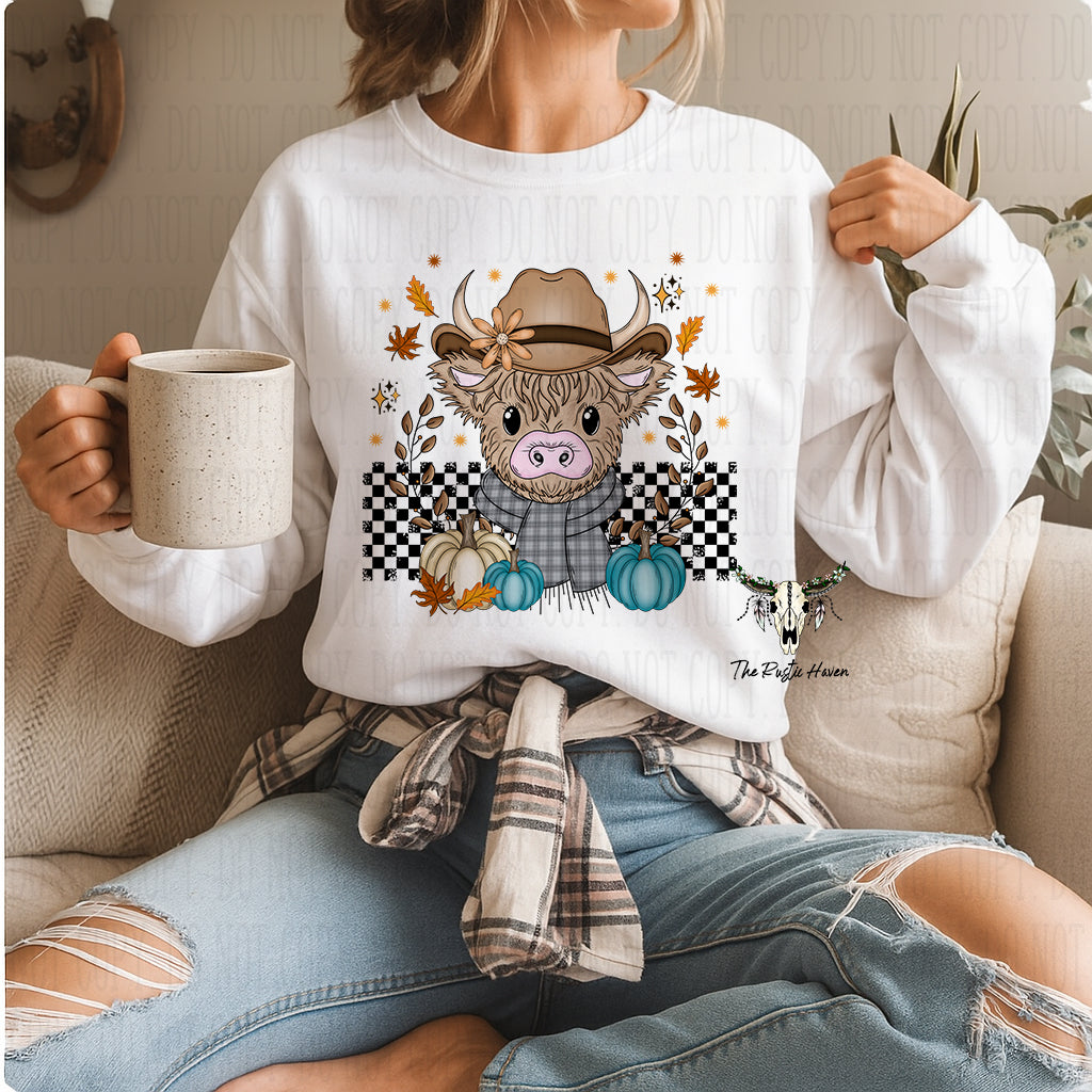 Add a touch of cozy farmhouse charm to your fall wardrobe with this Highland Cow Fall long Sleeve T-shirt! Featuring a lovable highland cow in a fall hat and scarf, surrounded by pumpkins, checkered accents, and autumn leaves, this pullover is perfect for sipping coffee, pumpkin patch trips, or lounging in crisp autumn weather.