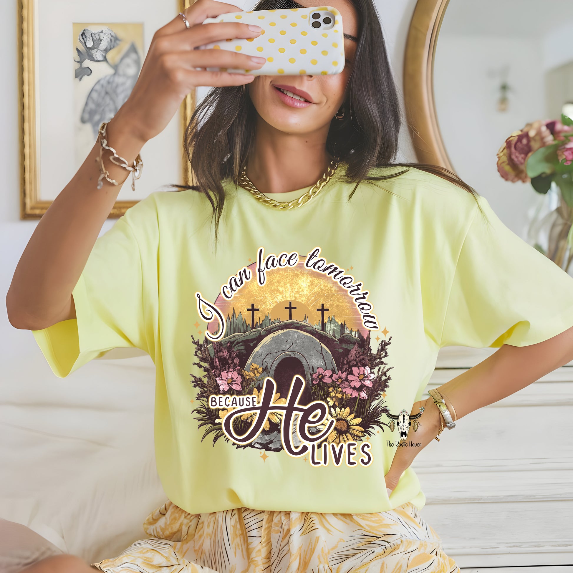 Embrace every day with hope and faith wearing our "I can face tomorrow, Because he lives" T-shirt. Let the uplifting message remind you that with the strength of your beliefs, you can conquer any obstacle. Stay positive and inspired with every wear.