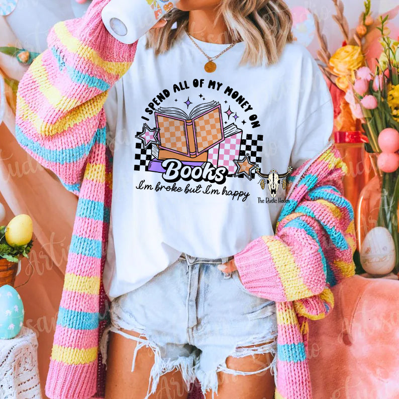 Upgrade your wardrobe with our "I Spend all of my money on books T-shirt"! Showcase your love for reading and embrace the broke but happy life. Made with quality material, this shirt will make a statement while keeping you comfortable. Join the bookworm club now!