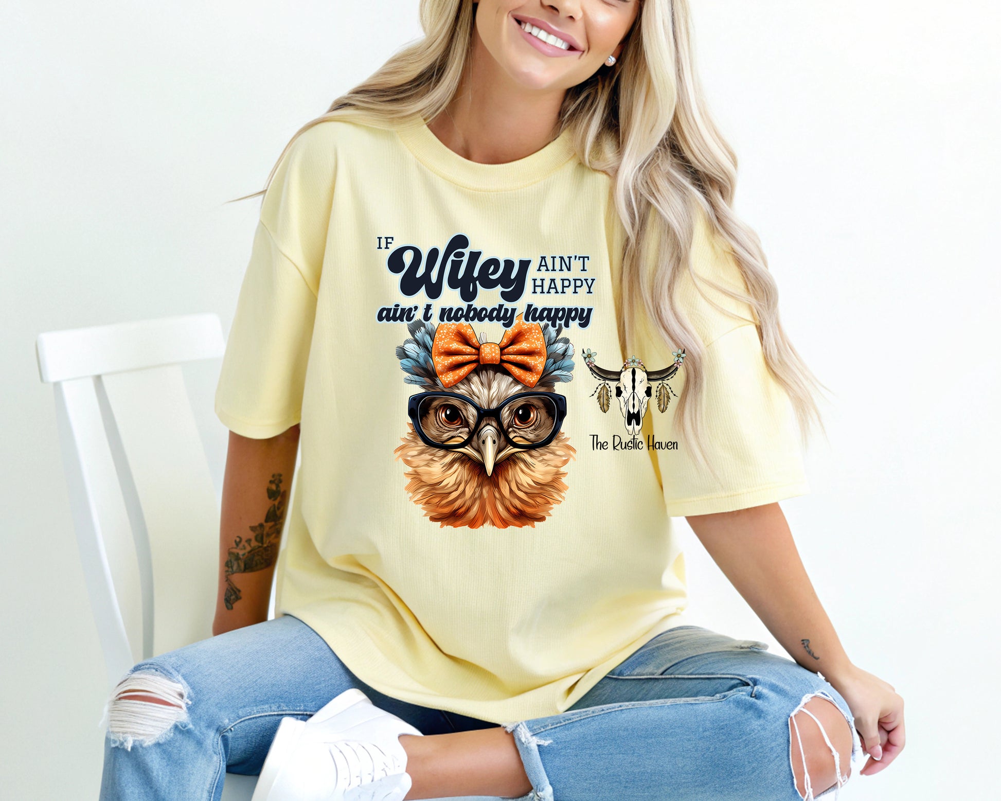 Keep the whole fam happy with this quirky "If wifey ain't happy, ain't nobody happy" T-shirt featuring a playful chicken design. No more bad moods, just good laughs and happy vibes all around! (P.S. Don't test the theory, just trust us!)