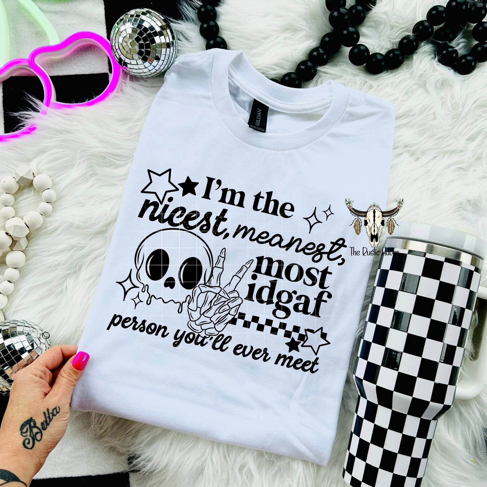 Be the nicest, meanest person in town with our "I'm the Nicest, Meanest T-Shirt"! This shirt not only features a cute and funny design, but also showcases your carefree and blunt personality. Be unapologetically you in this quirky tee. (Hilariously unique and unfiltered!)