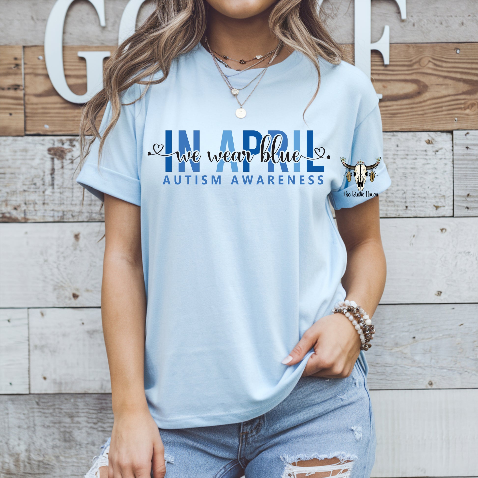 Celebrate Autism Awareness month with our "In April we wear blue" T-shirt! Show your support for the cause and raise awareness with this stylish, comfortable tee. Wear it proudly and inspire others to do the same. Available now!