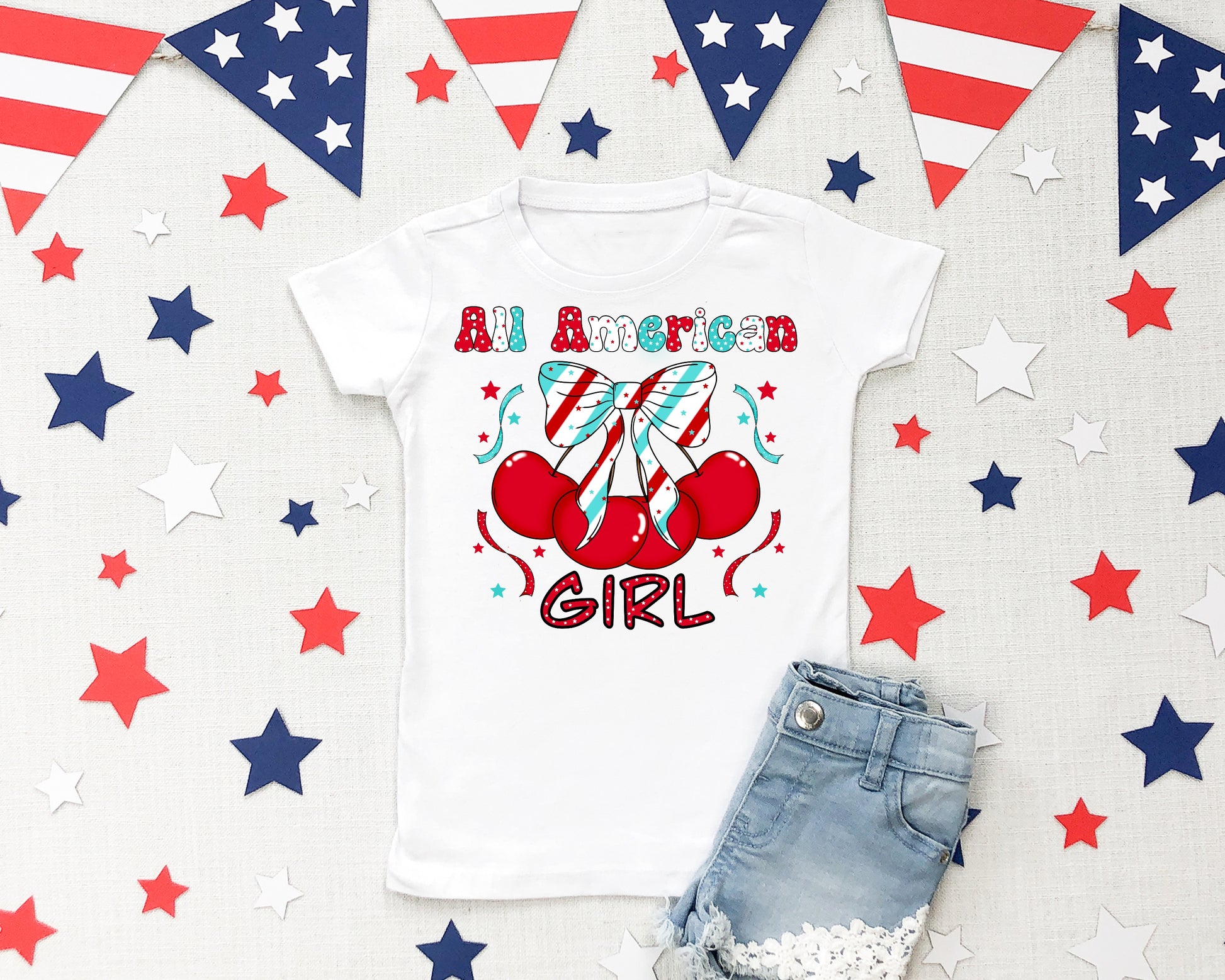 Celebrate Independence Day with our Girls  All American Girl T-Shirt. Made with high-quality materials, this t-shirt features a patriotic design that your child will love. Show off their American pride and add a touch of fun to their wardrobe. Perfect for any 4th of July celebration.