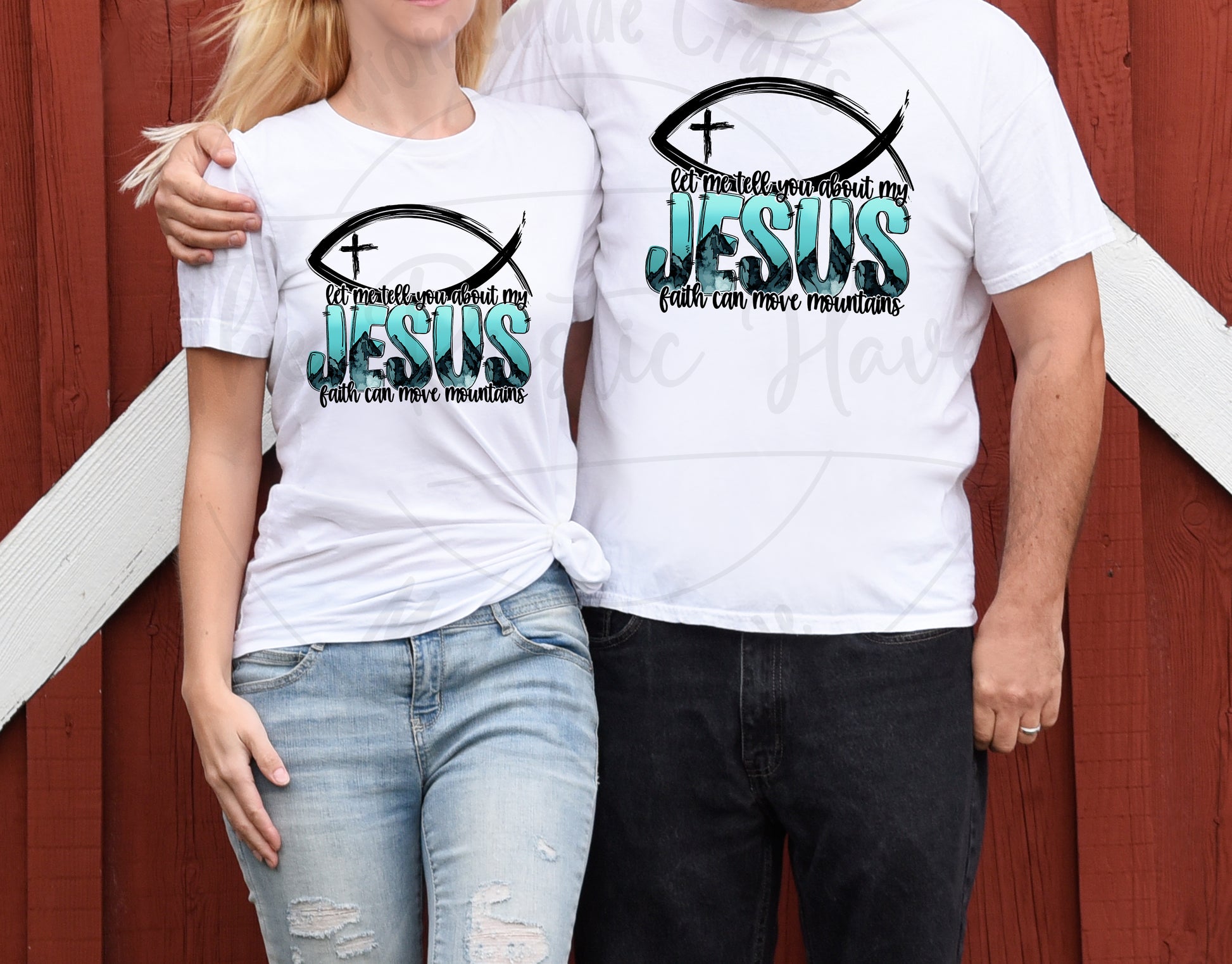 Introduce your faith with this "Let Me Tell You About My JESUS, Faith Can Move Mountains" t-shirt. With a powerful message and a bold design, this shirt serves as a reminder that faith can truly move mountains. Spread your belief with this comfortable and stylish tee.