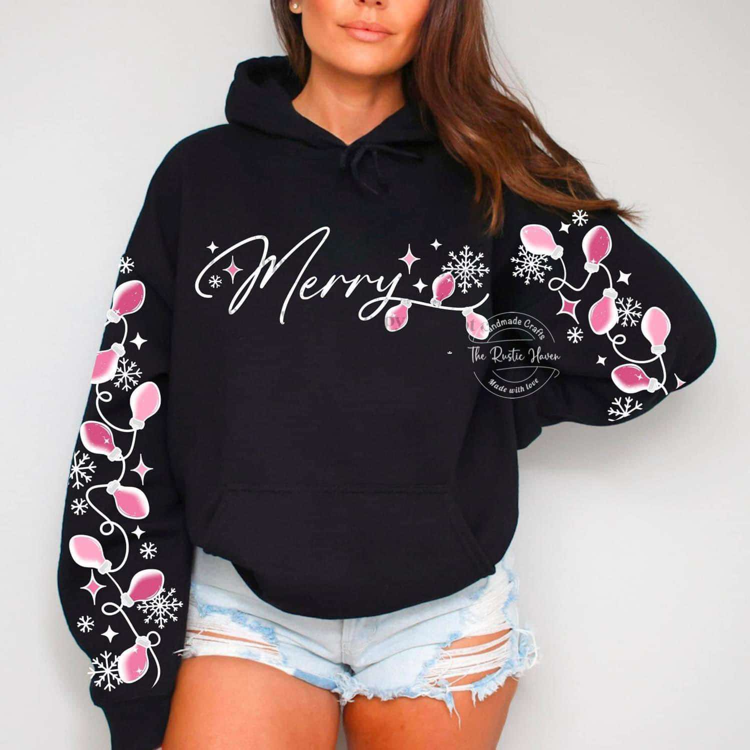 This cheerful design features elegant “Merry” lettering surrounded by glowing Christmas lights and snowflakes — available in your choice of multicolored lights or pink lights for a fun, personalized touch.