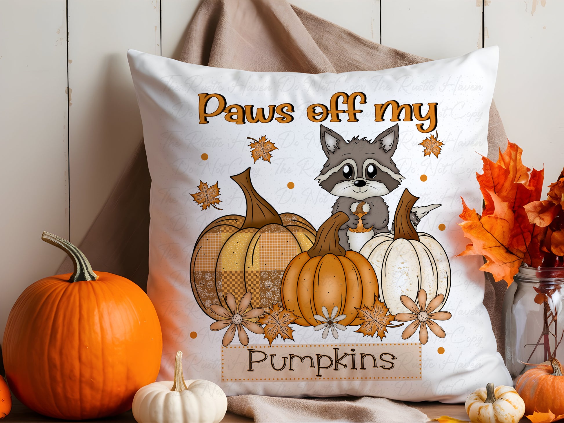 Paws Off My Pumpkins Raccoon Fall Pillow – Cozy Autumn & Thanksgiving Home Décor