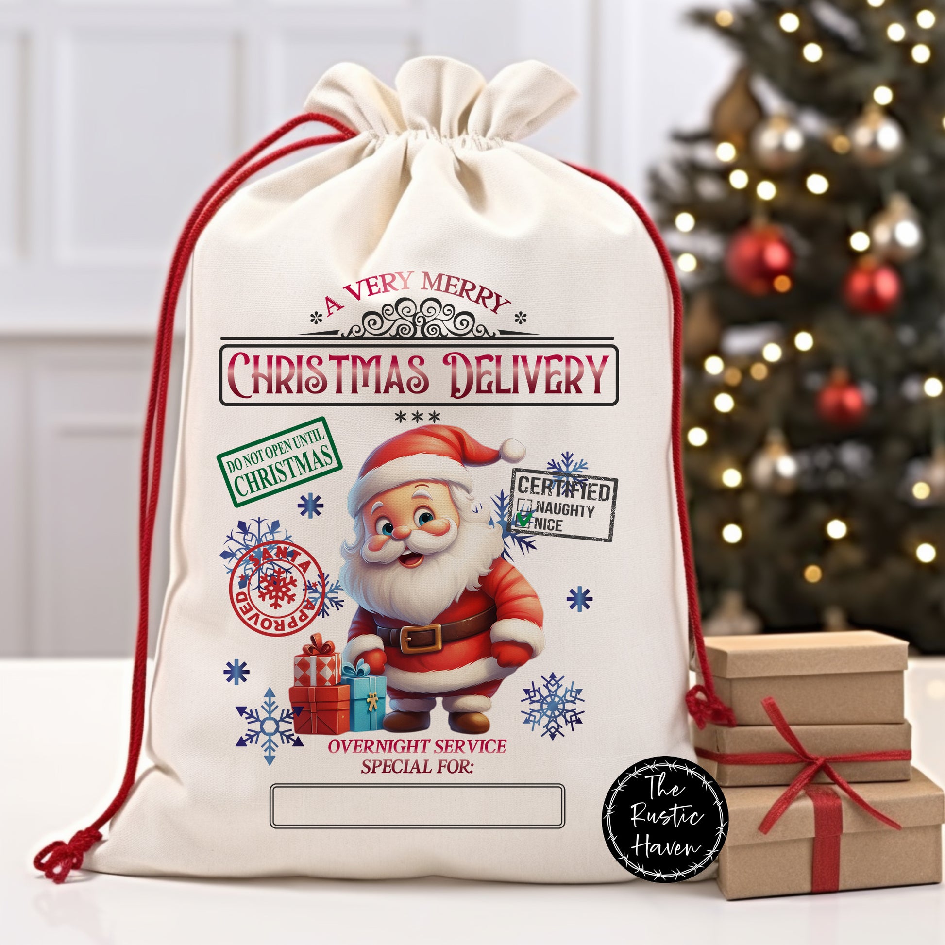 Customize your holiday gift giving with our Personalized Adorable Santa Claus Santa Sack. This playful sack features a cute Santa design and can be personalized with a name, making it a unique and fun way to distribute gifts. (No more confusing piles of presents!)
