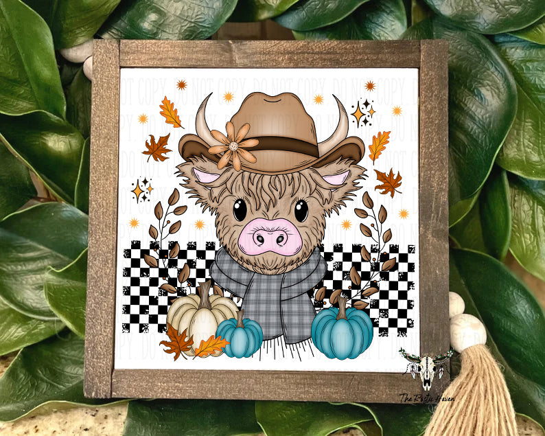 Rustic Fall Highland Cow Sign – 8x8 Autumn Farmhouse Decor