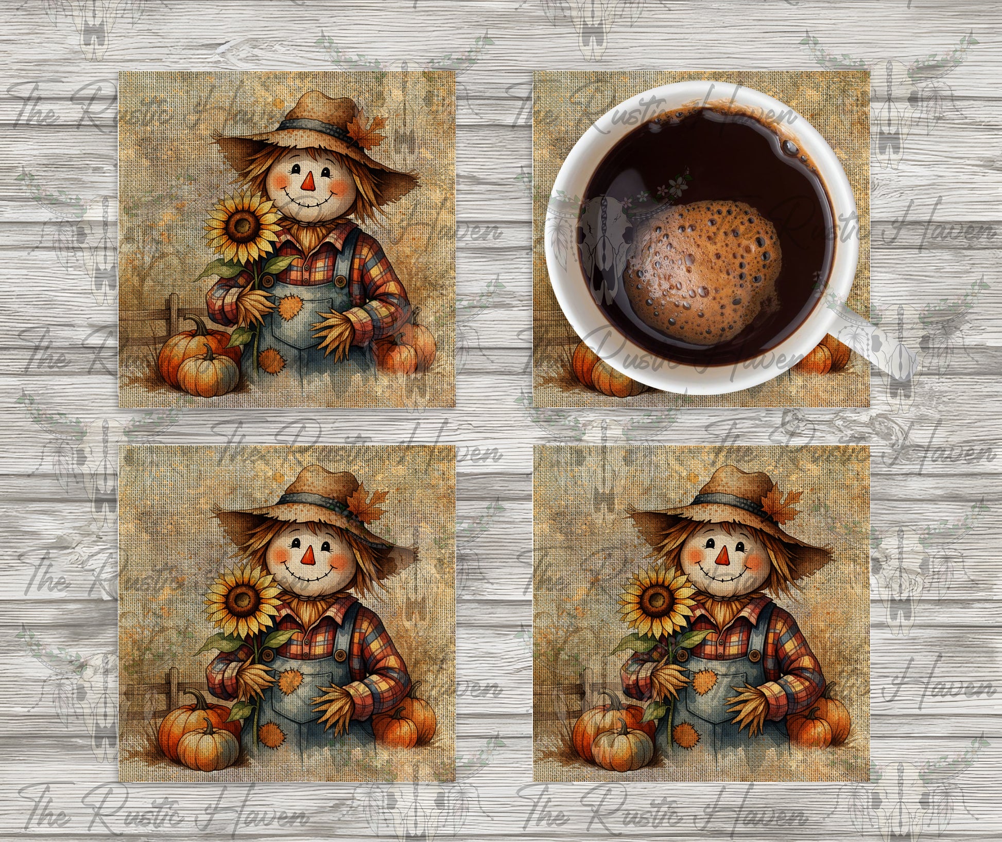 Bring cozy farmhouse charm to your home this fall with our Rustic Scarecrow Coaster Set. Each set includes 4 beautifully printed coasters, featuring a cheerful scarecrow surrounded by pumpkins and sunflowers – the perfect touch of autumn warmth for your table décor.