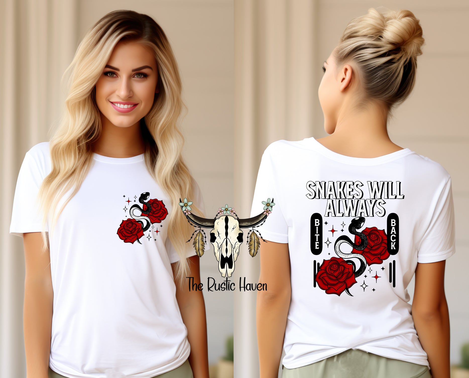 This T-shirt reminds us that snakes will always bite back. Features a unique pocket design on the front and a powerful back design. Show your boldness and resilience with this striking shirt.