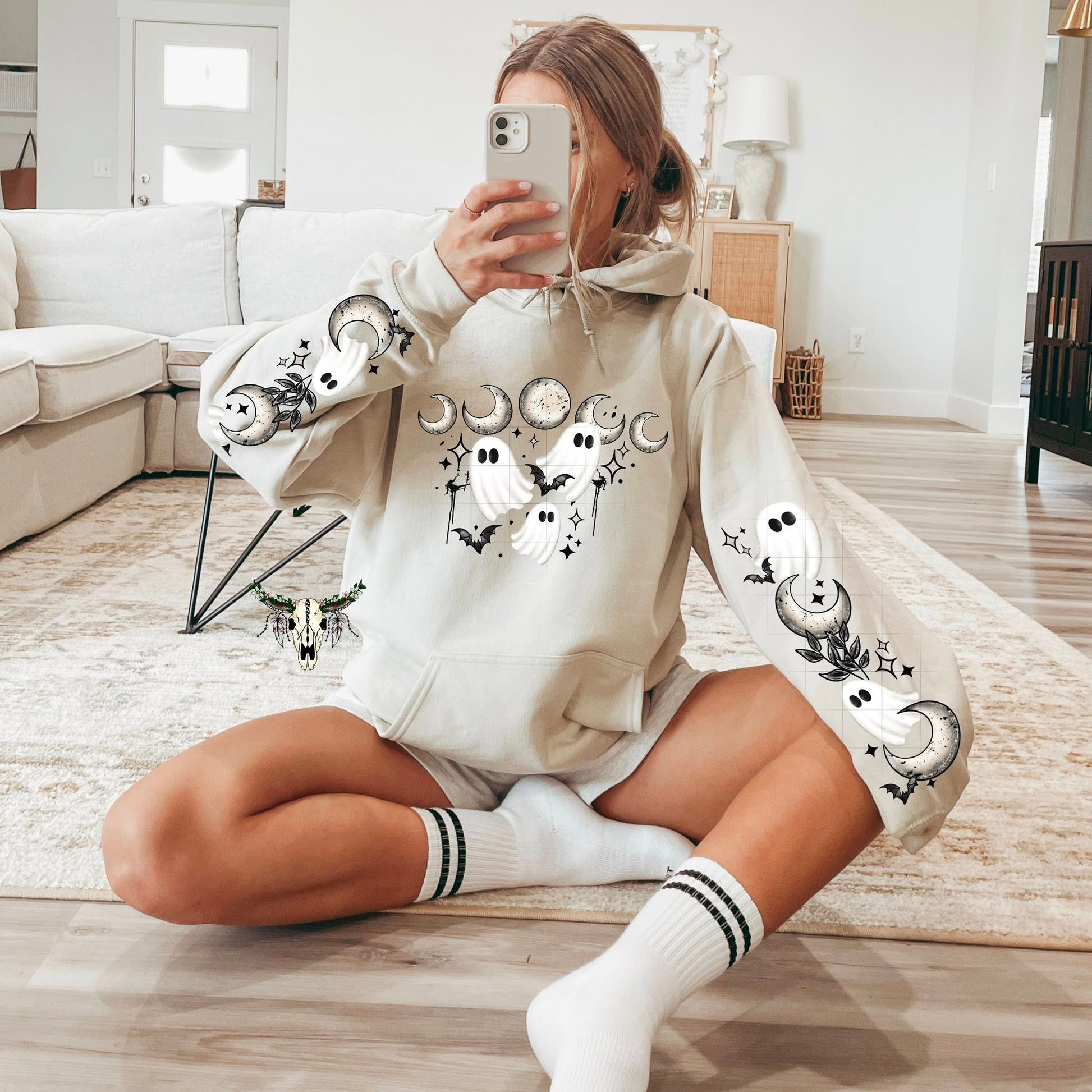 Get into the spooky spirit with this cozy Moon & Ghost Long sleeve tee adorable ghost graphics, celestial moon phases, bats, and stars printed on the sleeves and front, this hoodie is perfect for Halloween lovers and year-round spooky vibes. Made with soft, breathable fabric, it’s designed for comfort whether you’re lounging at home or stepping out for a casual night. A must-have for ghost and moon aesthetic fans!