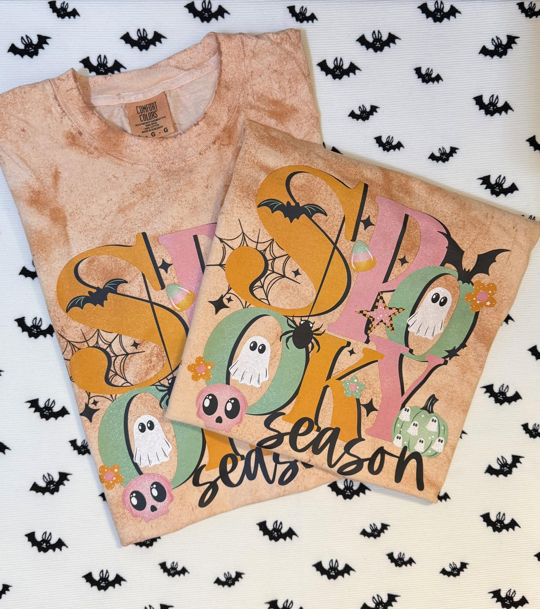 Celebrate the spooky vibes in style with our "Spooky Season"  Halloween color blast t-shirt! This cozy Comfort Colors tee features a fun and festive design with playful ghosts, bats, candy corn, pumpkins, spiders, and pastel Halloween colors – perfect for autumn lovers and Halloween enthusiasts.