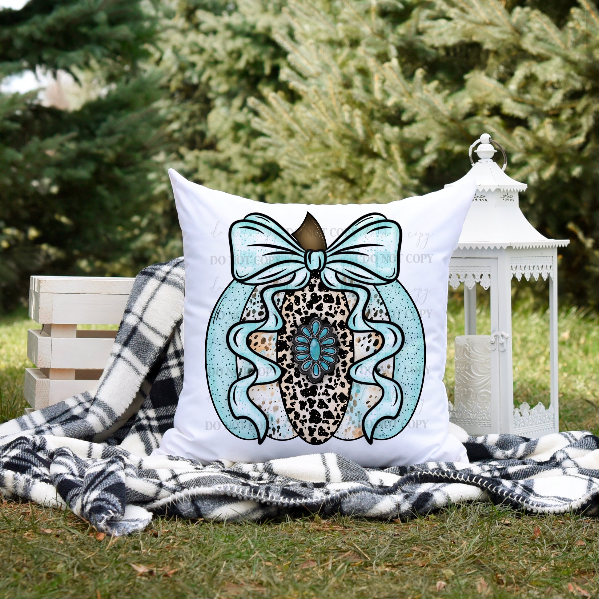 Elevate your seasonal decor with this stunning Western-inspired throw pillow. Showcasing a beautifully illustrated leopard print pumpkin wrapped in a turquoise bow with a floral gem center, this piece brings together bold country charm and cozy autumn vibes.